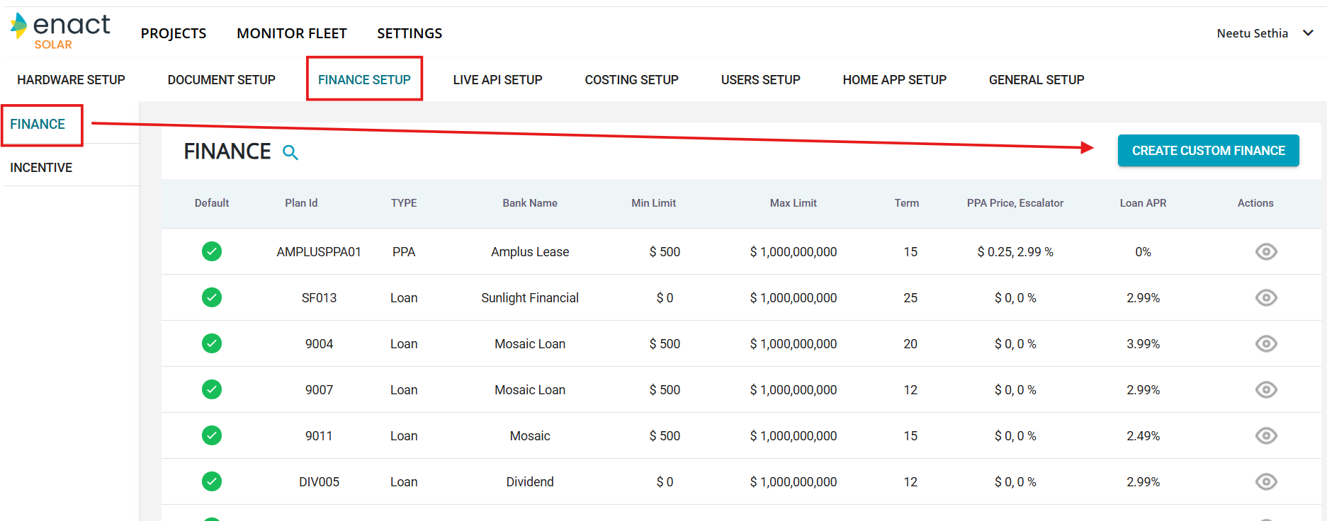 Click on Create Custom Finance