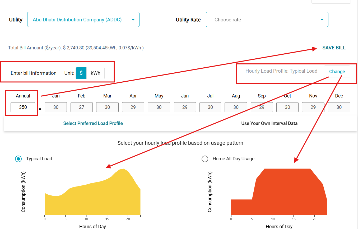 You will find the default $2400 annual bill amount as a placeholder. Entering actual data as an annual input will change the corresponding monthly values based on the selected load profile. You can also input the monthly values, bringing change to the corresponding annual consumption number. In both above cases the hourly consumption is used in calculations ahead and they will be generated based on the selected load profile.