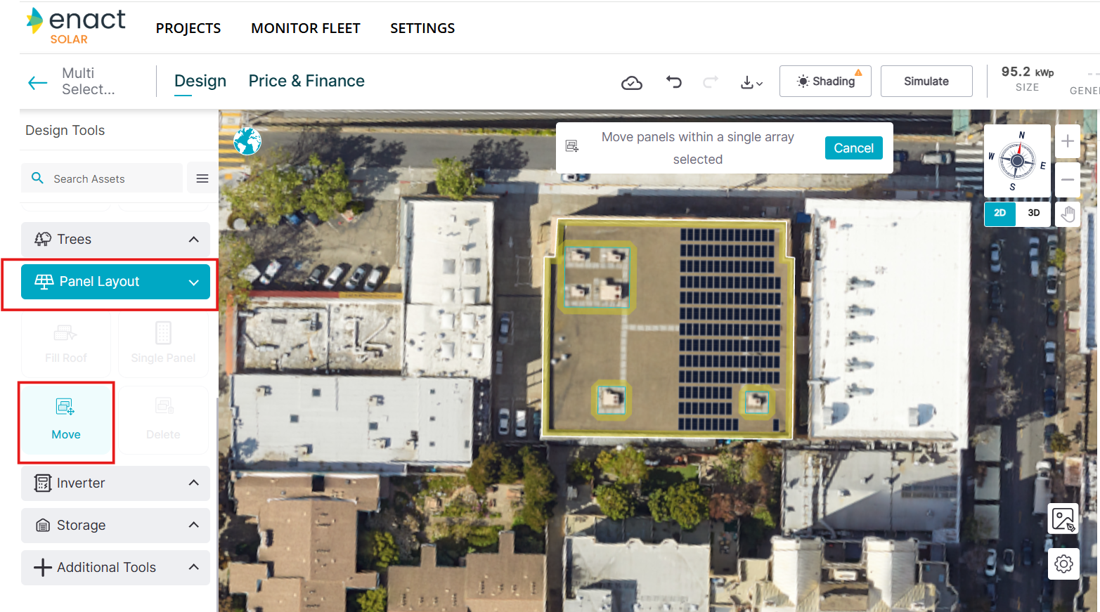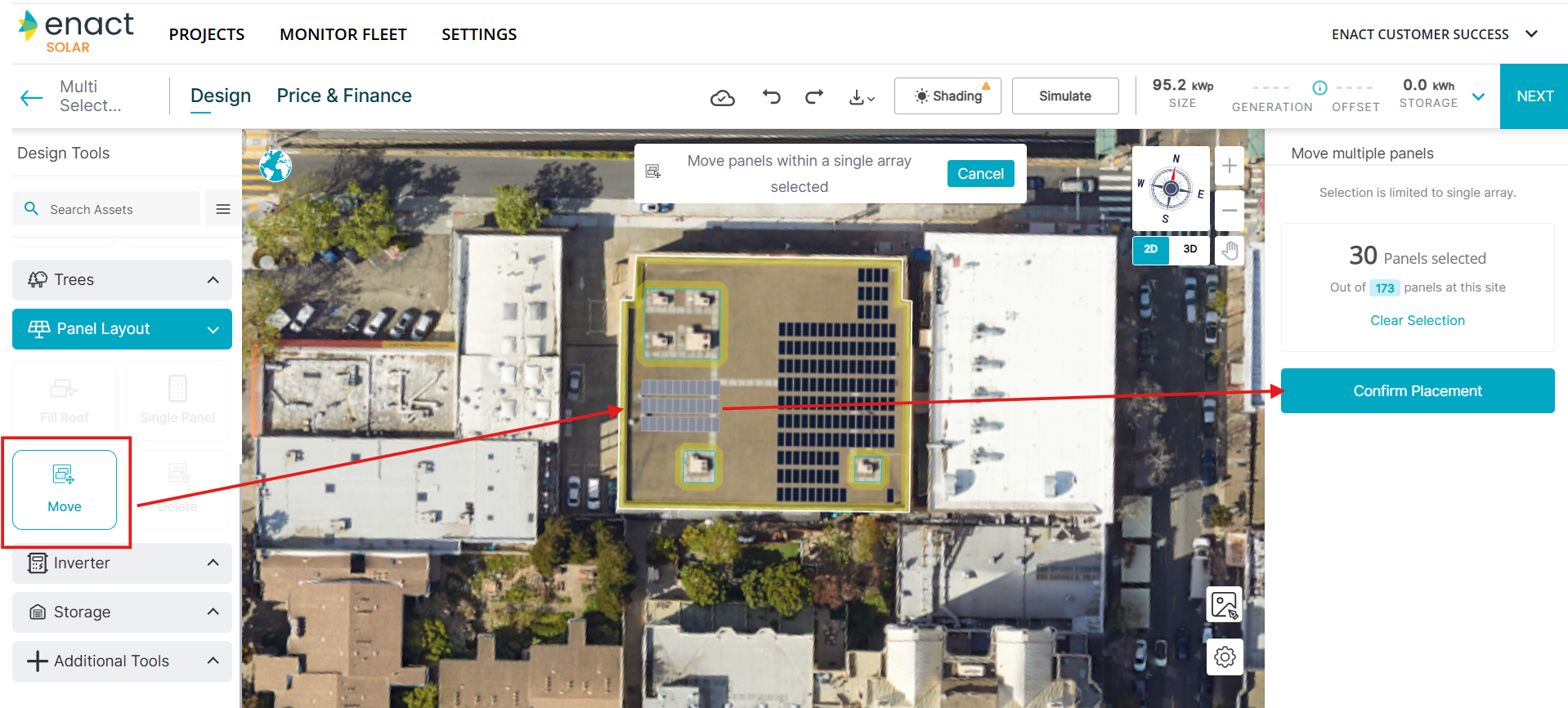 Note: Enact will turn the selected panels to red or yellow if placed near an obstacle or a setback. You will then be required to confirm placement, after which the remaining panels (not impacted by invalid positioning) would get placed on the roof.You can select and move a maximum of 500 panels.